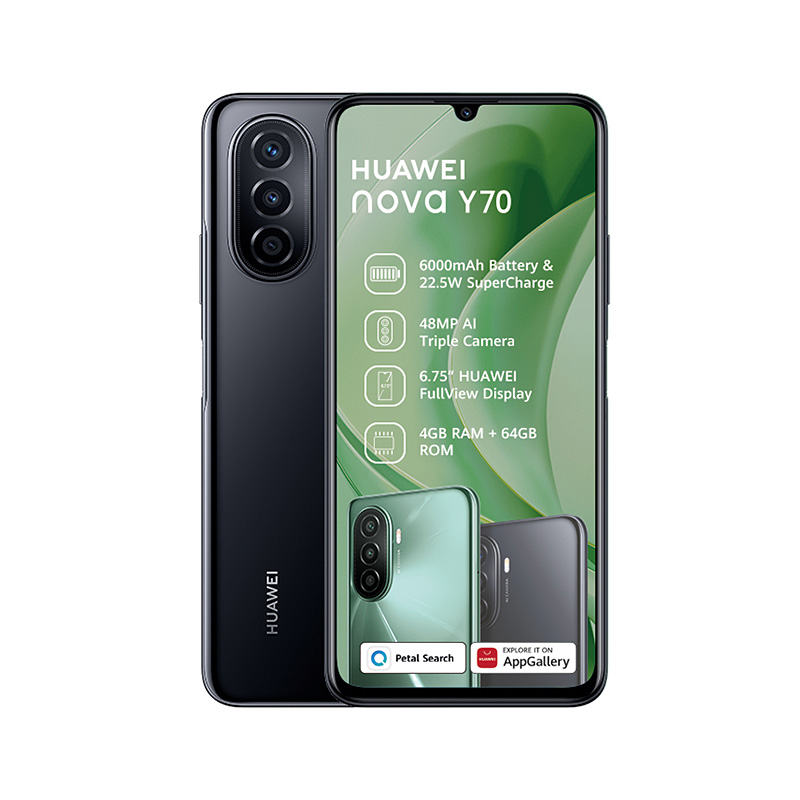 The Huawei Nova Y70 offers a large display, long-lasting battery and solid camera setup—all packaged in a sleek modern design. With its 6.75-inch FullView display, 6000 mAh battery, and 48 MP triple AI camera, it’s built for everyday multitasking, media consumption and staying powered throughout the day. Huawei Consumer+2Huawei Consumer+2